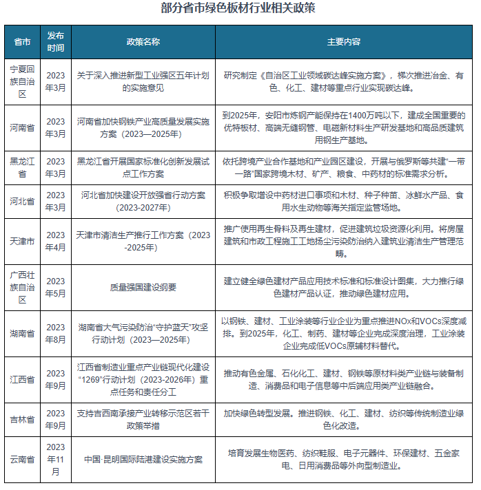 绿色板材又称绿居材,是指以木材或非木质动物纤维为次要原料,加工成各类材料单位,(或不)胶粘剂和其他添加剂,其出产、利用及烧毁过程均应合适国度相关环保和健康尺度要求的人制板材。充实阐扬丛林多种功能,鞭策林业高质量成长。近年来,为了推进绿色板材行业的成长,我国连续发布了很多政策,如2023年地方、国务院发布的《深化集体林权轨制方案》提出加强木本粮油、木材、竹材、丛林药材等主要初级林产物供给能力扶植,激励林业大省、大市、大县培育林业支柱财产。