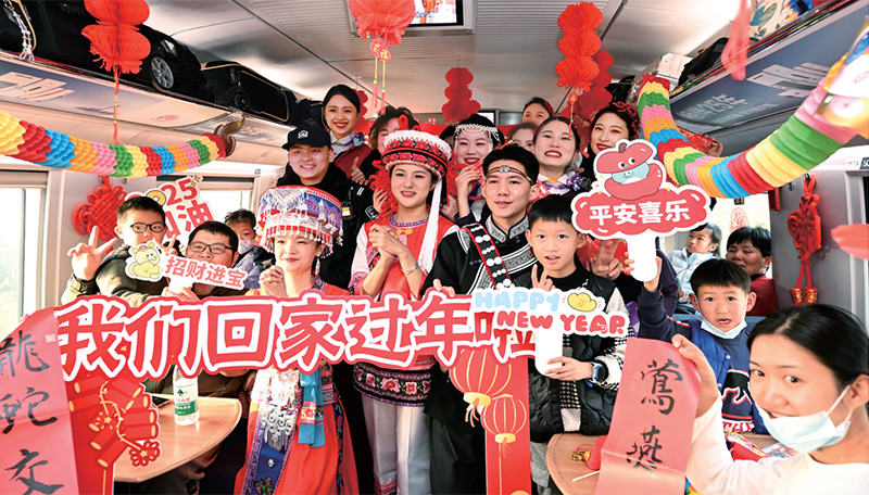 夏历小年到临之际,上海客运段高铁四车队正在由上海虹桥坐发往厦门北坐的G1653次列车上举办“中国年,平易近族情,齐聚高铁过小年”从题勾当,让搭客正在旅途中感触感染稠密的节日空气。图为2025年1月21日,铁上海客运段职工取搭客正在车厢里合影。 发 陈浩明/摄。